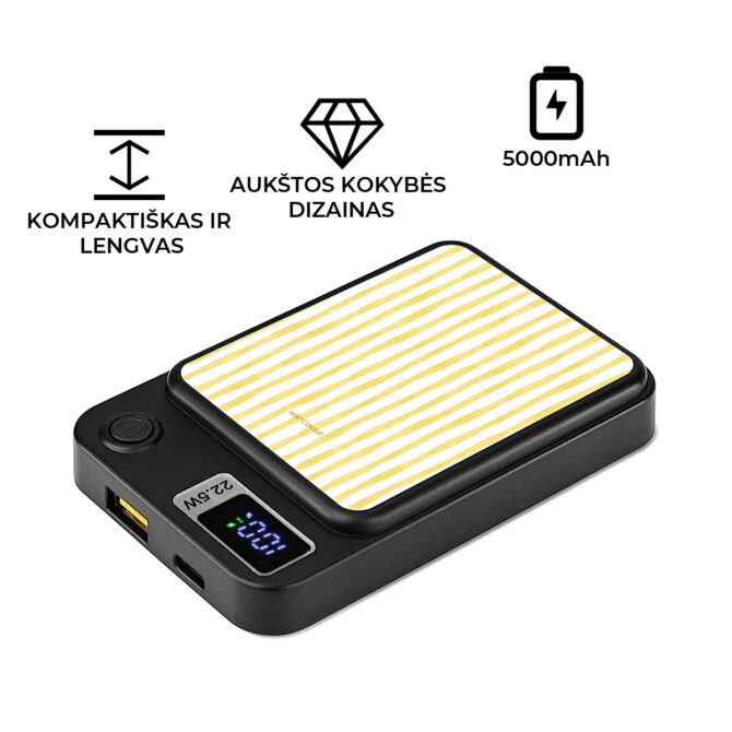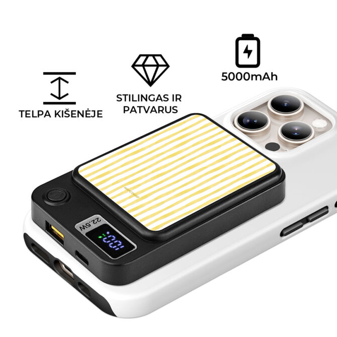 Dėl stipraus magnetinio ryšio jis tvirtai prisitvirtina prie MagSafe suderinamų „iPhone“ telefonų ar „Android“ modelių su MagSafe dėklais. Taip pat gali įkrauti laidu – dar greičiau ir patogiau. Lengvas, kompaktiškas ir sukurtas kasdieniam naudojimui – pakankamai mažas, kad visada turėtum su savimi, ir pakankamai galingas, kad išlaikytų tave įkrautą visą dieną.
