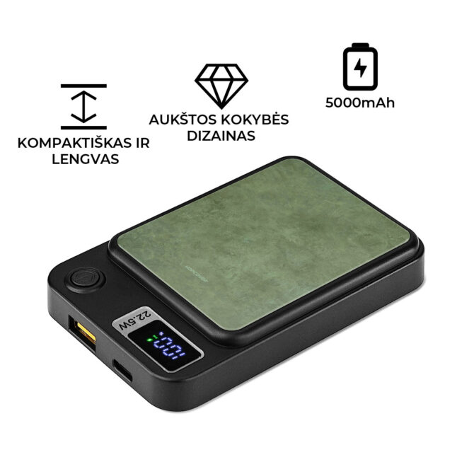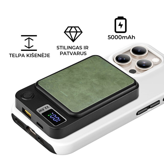 • MagSafe suderinamumas: veikia su „iPhone 12“ ir naujesniais modeliais bei „Android“ telefonais, turinčiais MagSafe dėklus arba palaikančiais belaidį įkrovimą.