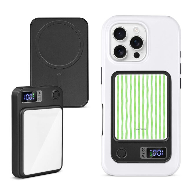 Įkrauk telefoną bet kur su Hopcover Magnetic Power Bank – tobulu dizaino ir funkcionalumo deriniu. ⚠️ Pastaba: magnetinė funkcija veikia tik su MagSafe suderinamais telefonais (iPhone 12 ir naujesniais) arba Android telefonais, turinčiais MagSafe dėklus ar palaikančiais belaidį įkrovimą. Su 5000 mAh Li-Polymer baterija, greitu belaidžiu įkrovimu ir stilingu grūdinto stiklo paviršiumi, jis ne tik palaiko tavo telefono energiją, bet ir išsiskiria savo išvaizda.